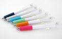 シンプルな定番デザイン、かつ名入れの映える白軸ボディにカラフルなグリップ持ち手での販促グッズとして最適なボールペンです。10万回の開閉試験をクリアした耐久性に優れたねじりバネ採用のクリップ付きボールペン。開閉ストロークが大きいので分厚いものも挟み易いです。
